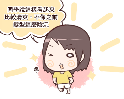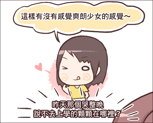 同學的清爽說詞讓他完全忘記昨晚留了一年多的頭髮被剪短的難過