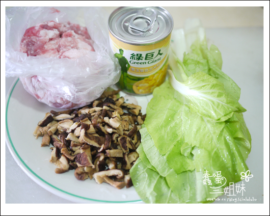 .瘦豬肉切絲;小白菜切段狀;香菇先用水泡軟後切丁後