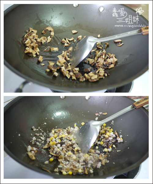 油入鍋中熱鍋,加入香菇爆香,再加入瘦豬肉拌炒