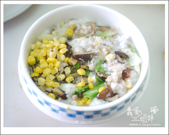 稀飯 1/2碗、玉米粒 綠巨人玉米7oz半罐、瘦豬肉 35g