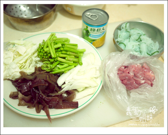 洋蔥、高麗菜、木耳切絲,綠蘆筍切段備用