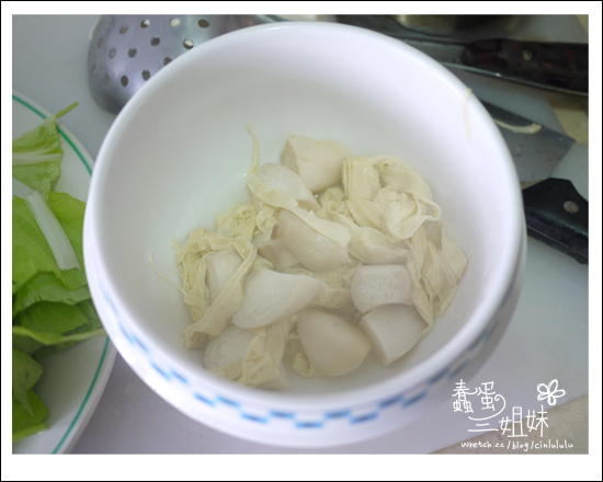 杏鮑菇切塊、濕豆皮切塊(或切絲) ,用鹽水汆燙備用