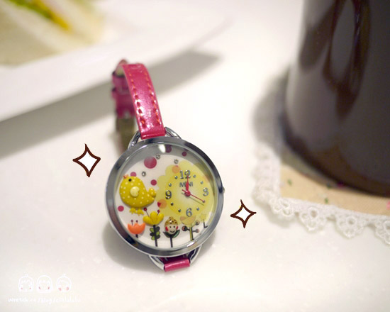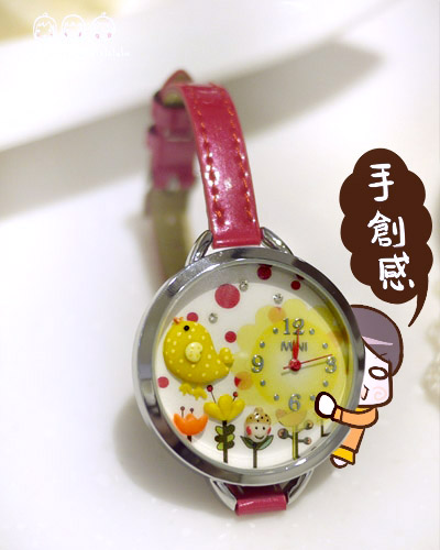 粉紅亮面的的細錶帶,跟錶盤的黃色小雞意外的相搭